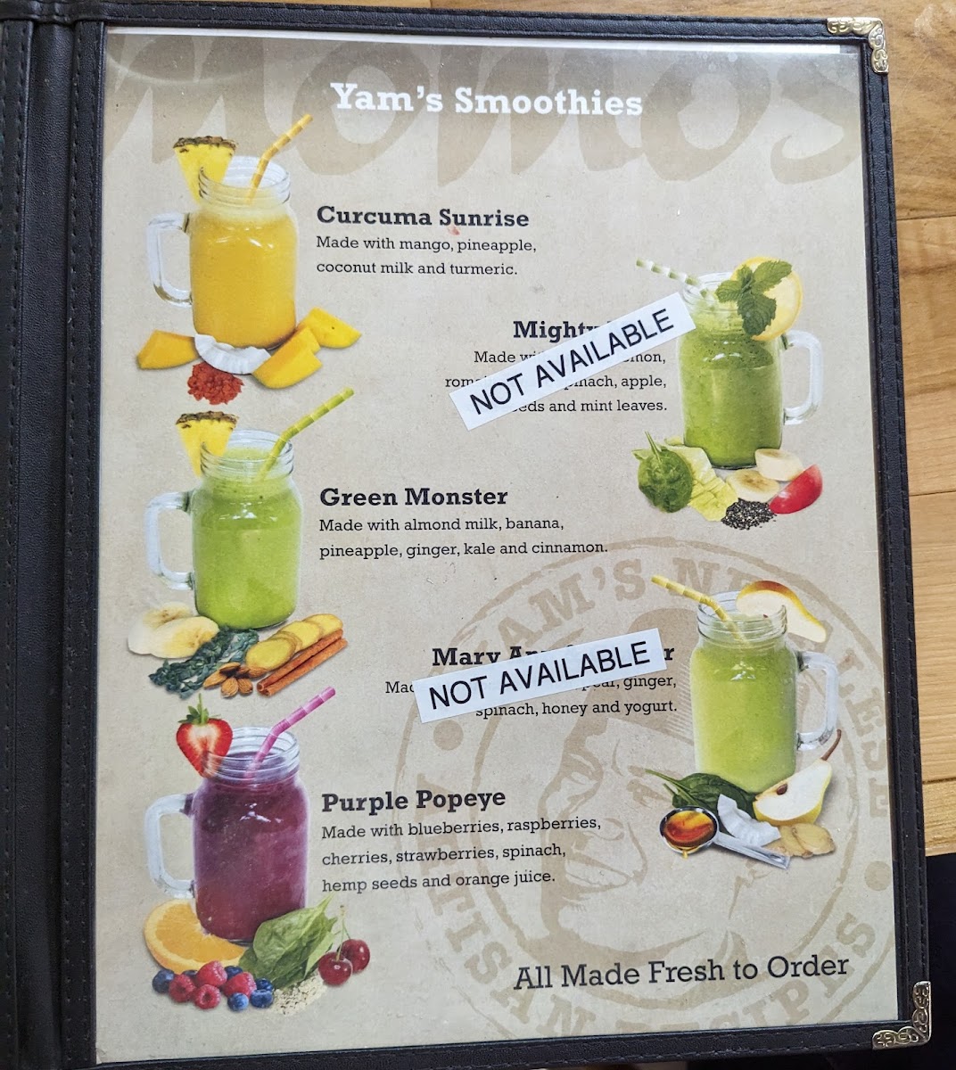 As for the beverages, Yam's Smoothies offer a refreshing selection that complements the meal perfectly. Try the TropiKale Thunder (CA$9.00) for a tropical twist or the Purple Popeye (CA$9.00), packed with vibrant berries and greens.